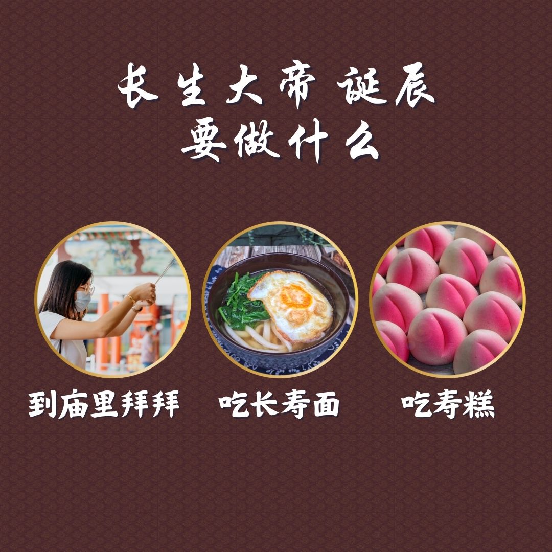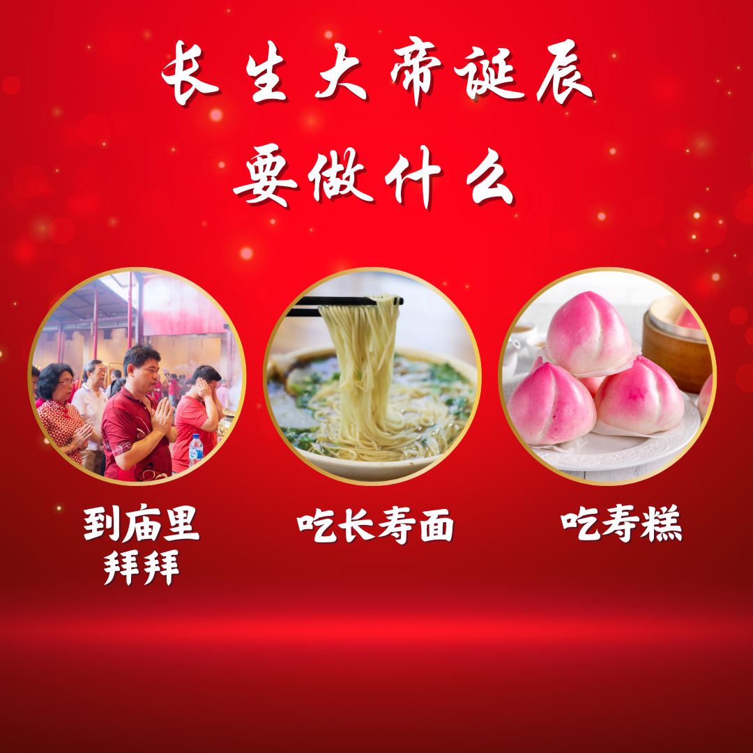 每年的农历五月初一,是华人道教信仰中南极长生大帝的诞辰,善信们都会在这一天到庙里拜祭,祈求长生大帝保佑,并且会在在拜祭完毕之后邀请亲朋好友来家里享用寿糕和寿面,祈求喜乐绵长,延年延寿。